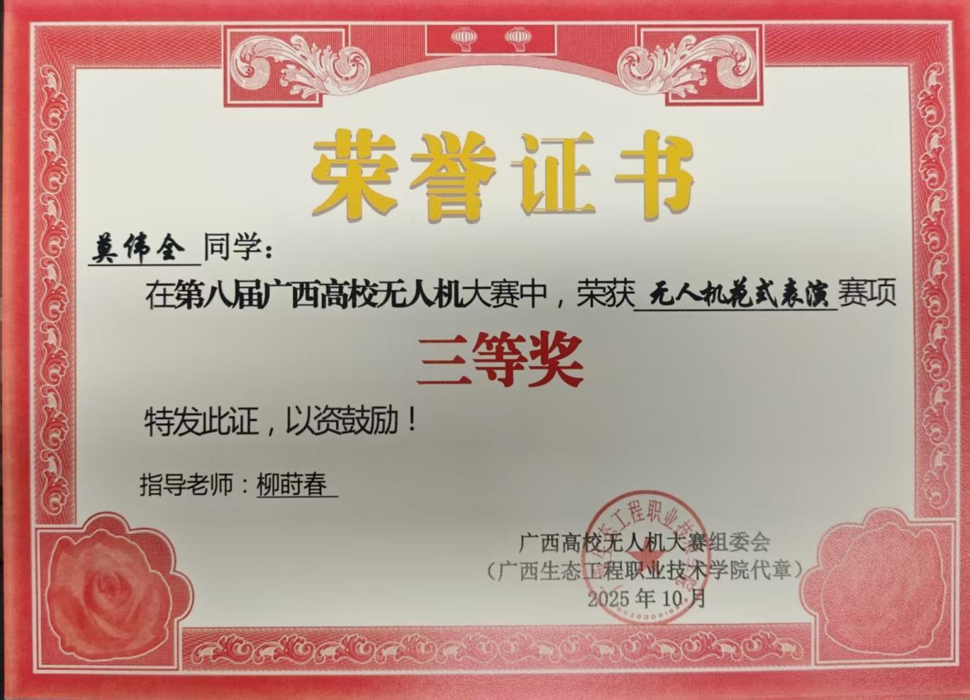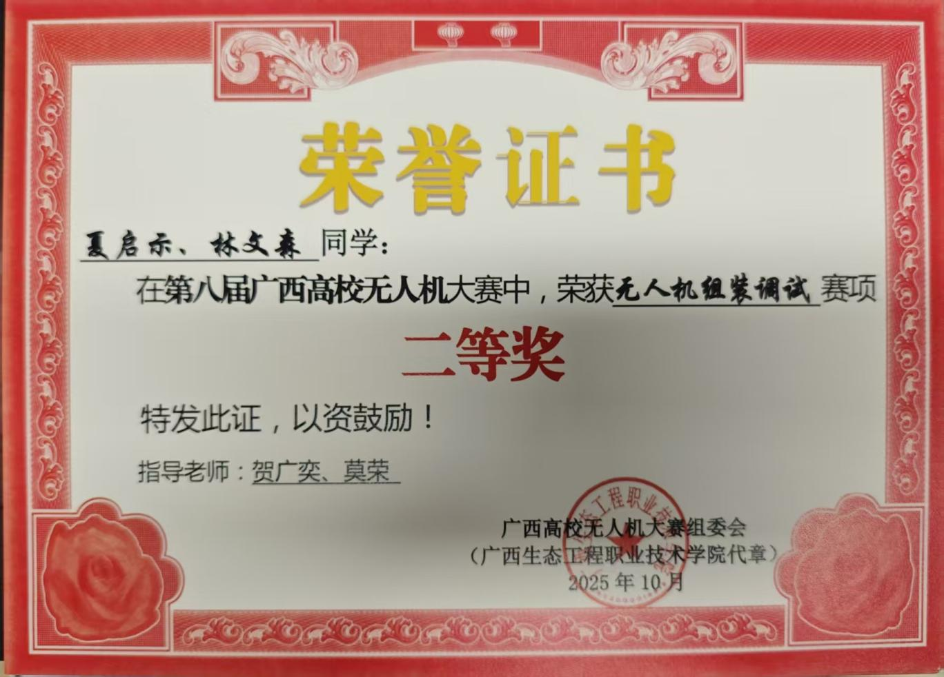 近日,第八届广西高校无人机大赛圆满落幕。beat365官网参赛团队凭借过硬的专业素养、默契的团队协作与敢闯敢拼的竞技精神,在多个核心赛项中脱颖而出,一举斩获3个二等奖、1个三等奖的亮眼成绩,实现了beat365官网在该赛事奖项上的零突破,全面展现了学校在无人机专业领域的人才培养硬实力,进一步拓宽了beat365官网在无人机应用领域的获奖覆盖面。