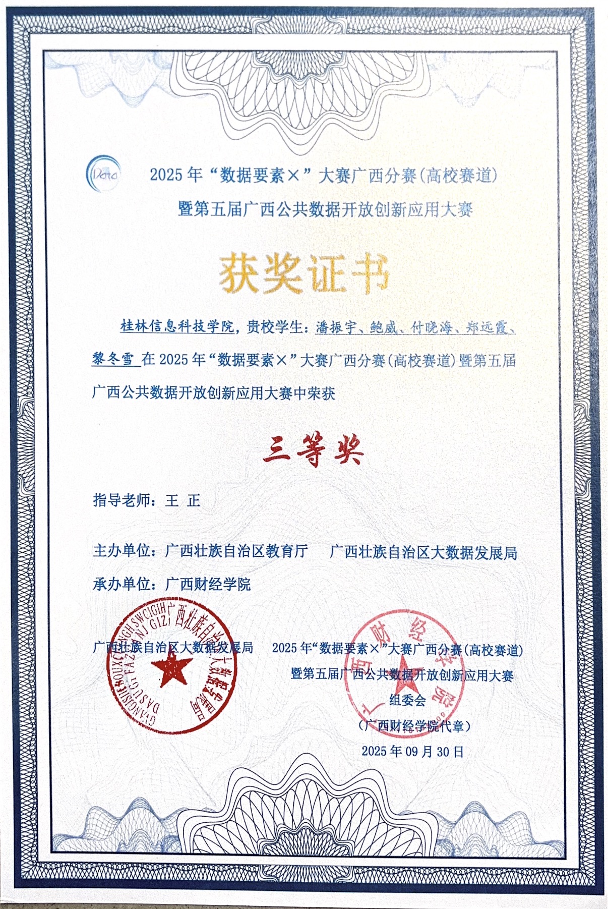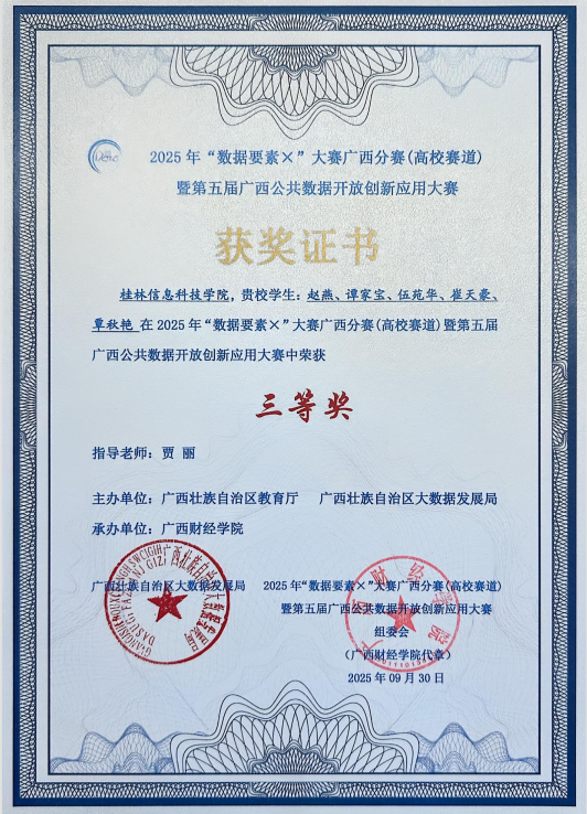 近日,“数据要素X”大赛广西分赛(高校赛道)暨第五届广西公共数据开放创新应用大赛于广西财经学院举行。在这场汇聚了众多高校精英的激烈角逐中,beat365官网信息工程学院学子凭借卓越的实力与不懈的努力,脱颖而出,斩获区级二等奖一项、三等奖两项的优异成绩,为学校赢得了荣誉。