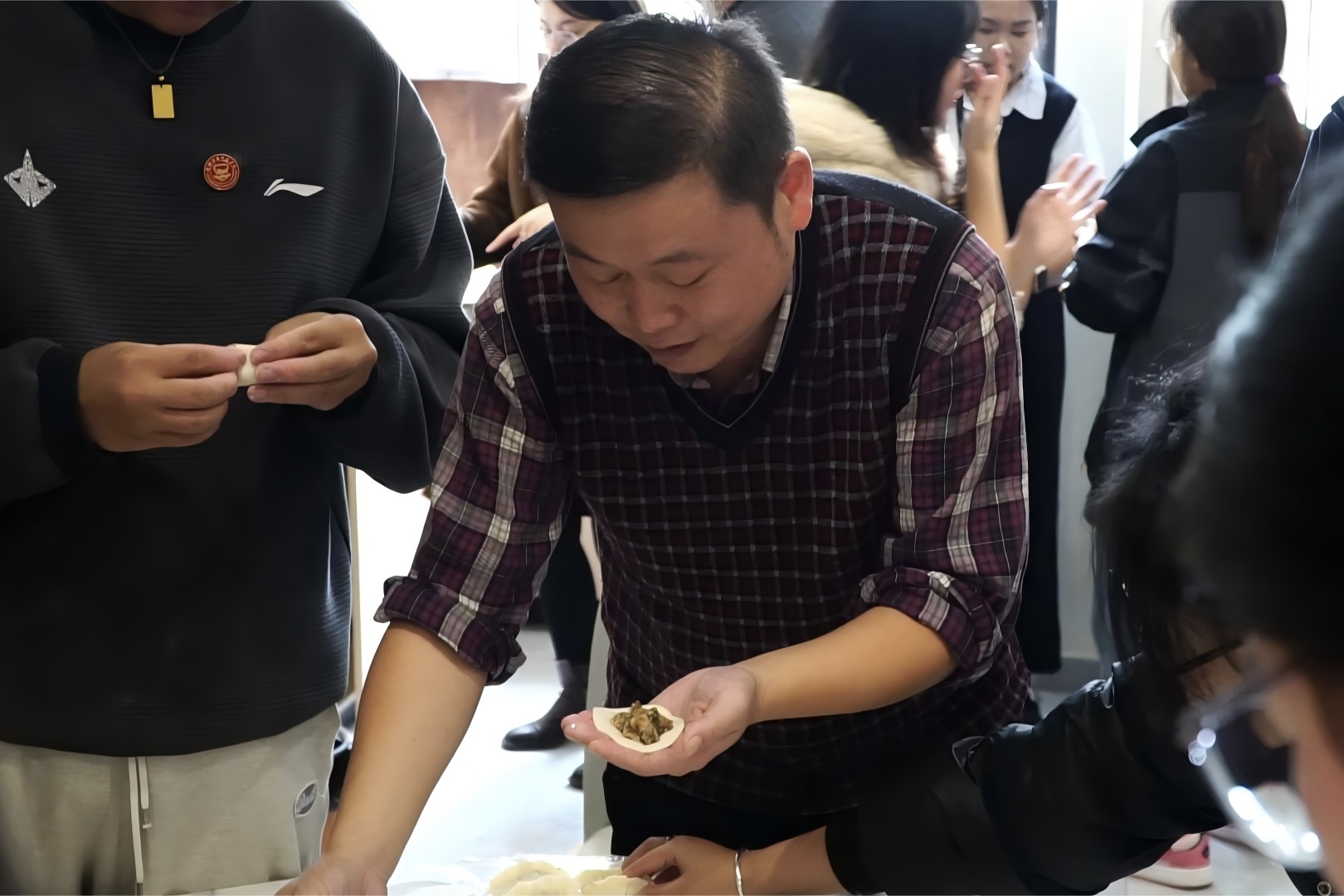 活动当天,悠扬的音乐伴着师生们的欢笑声,一站式学生服务中心共享厨房里热闹非凡。桌子上摆满了饺子皮、馅料,有经典的猪肉白菜馅、猪肉韭菜馅、猪肉玉米馅等,散发着诱人的香气。师生们纷纷挽起袖子,跃跃欲试。大家手法各异,有的熟练地捏出一个个精致的饺子,褶子均匀美观;有的则是初次尝试,包出来的饺子形状奇特,惹得周围人哈哈大笑。随着一盘盘形状各异的饺子被端上了餐桌,也将活动氛围推上了高潮。解庆林校长与师生们共同举杯庆祝,一同品尝着自己亲手包的饺子。现场充满了欢声笑语,气氛十分融洽。