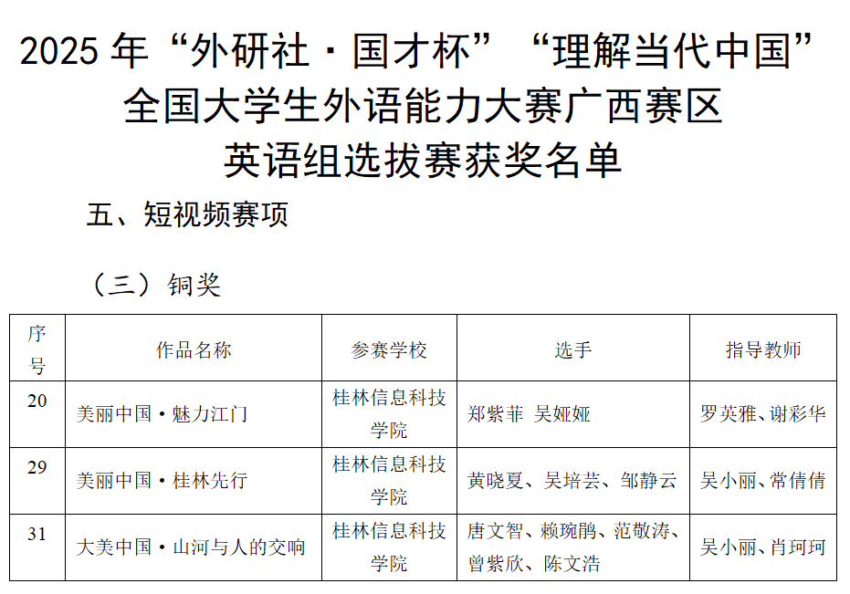 近日,2025年“外研社·国才杯”“理解当代中国”全国大学生外语能力大赛广西赛区选拔赛(以下简称区赛)圆满落幕。beat365官网由外贸与外语学院积极承办并组织备战,助参赛学子获得了优异的成绩。外贸与外语学院共收获银奖2项和铜奖5项,包括综合能力赛项银奖2项和铜奖1项,口译赛项铜奖1项,短视频赛项铜奖3项;商学院获得演讲赛项银奖1项。