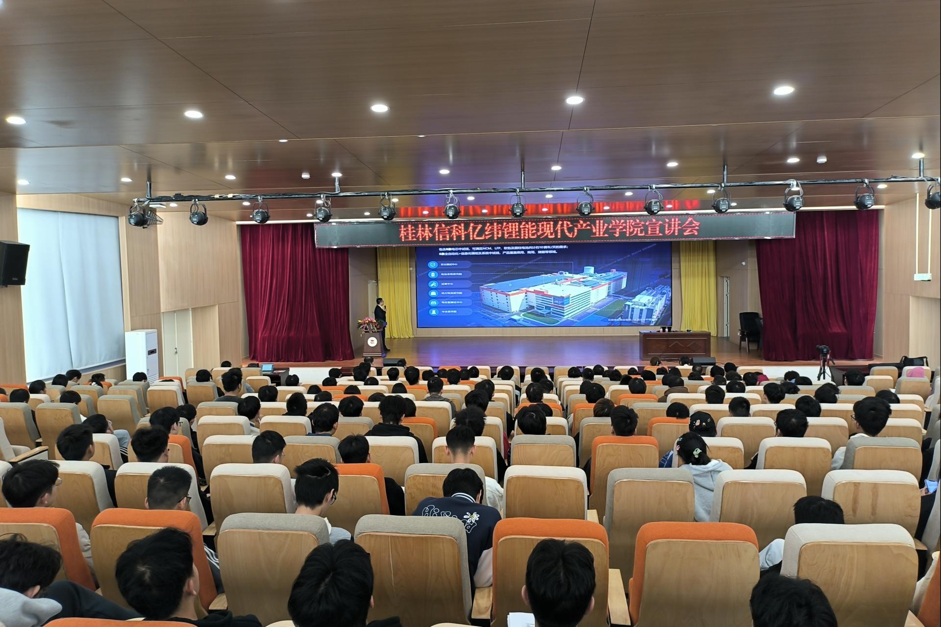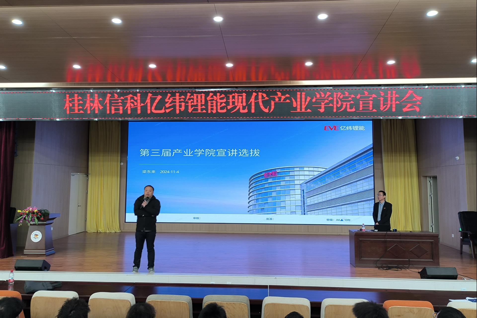 会上,文超书记首先介绍了产业学院的制定依据和过程、教育教学组织方案、人才培养模式。他指出,现代产业学院是学校应用型人才培养模式改革的重要举措,通过与企业合作,培养更多创新性应用型人才,为学生提供实践机会和就业渠道。接着,梁东来经理从企业规模、岗位福利、人才培养模式、岗位需求四方面对亿纬锂能公司展开详细的介绍,并通过翔实的数据介绍了前两届参加桂林信科亿纬锂能现代产业学院学生的成长计划和个人发展情况,让同学们对企业有了更深度了解,为他们的职业发展提供指导和帮助。最后,学生积极踊跃提问,梁经理对学生提出的疑问逐一解答,并鼓励同学们多学习、多积累,互动环节加深了学生对现代产业学院的了解,也使得学生对自身未来的发展规划进行思考。