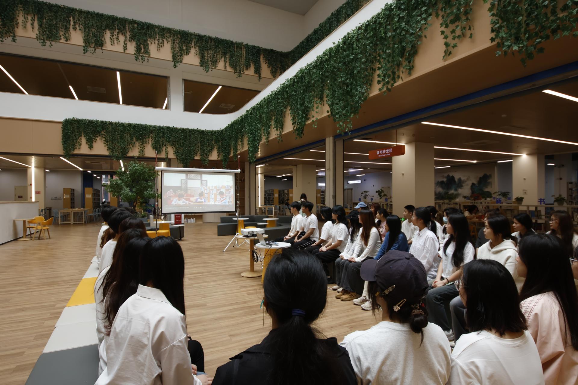 师生在读书沙龙区观看共读宣言宣传片