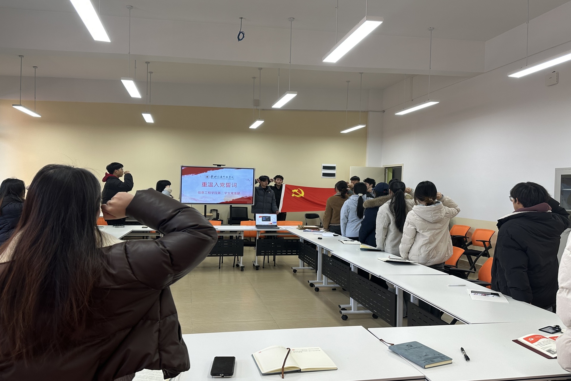 活动最后,全体党员面向鲜红的党旗,庄严地重温入党誓词。“我志愿加入中国共产党……”铿锵有力的誓言在会场内回荡,这不仅是对入党初心的深刻回溯与铭记,更是对理想信念的再次淬炼与升华。通过重温誓词,全体党员进一步强化了身份认同感和归属感,切实增强了为党育人、为国育才,以及推动学院和学校事业发展的使命感与责任感。