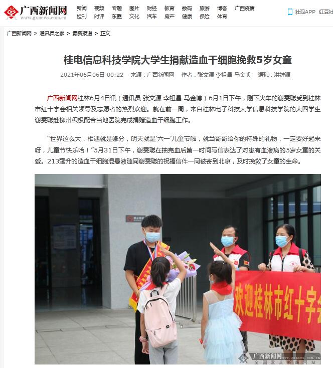 广西新闻网:桂电信息科技学院大学生捐献造血干细胞挽救5岁女童