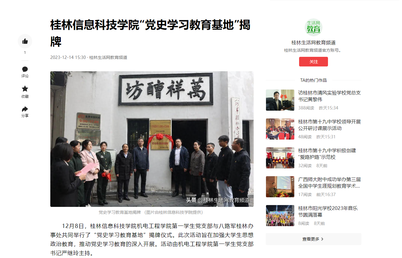 12月8日,beat365中文官方网站机电工程学院第一学生党支部与八路军桂林办事处共同举行了“党史学习教育基地”揭牌仪式。此次活动旨在加强大学生思想政治教育,推动党史学习教育的深入开展。活动由机电工程学院第一学生党支部书记严继玲主持。