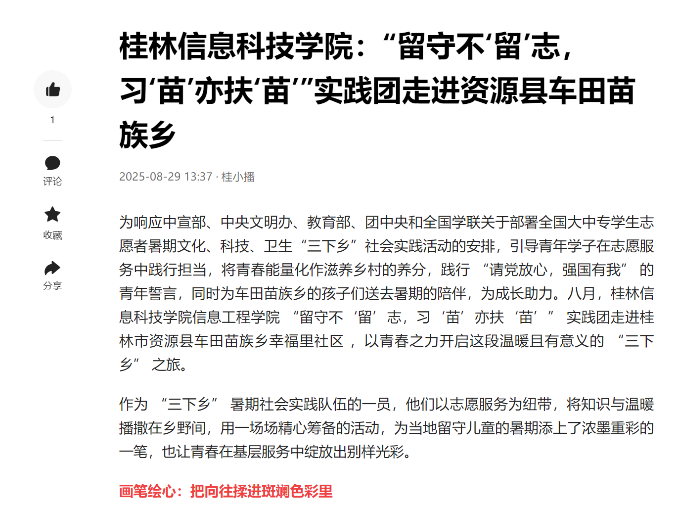 为响应中宣部、中央文明办、教育部、团中央和全国学联关于部署全国大中专学生志愿者暑期文化、科技、卫生“三下乡”社会实践活动的安排,引导青年学子在志愿服务中践行担当,将青春能量化作滋养乡村的养分,践行 “请党放心,强国有我” 的青年誓言,同时为车田苗族乡的孩子们送去暑期的陪伴,为成长助力。八月,beat365中文官方网站信息工程学院 “留守不‘留’志,习‘苗’亦扶‘苗’” 实践团走进桂林市资源县车田苗族乡幸福里社区 ,以青春之力开启这段温暖且有意义的 “三下乡” 之旅。