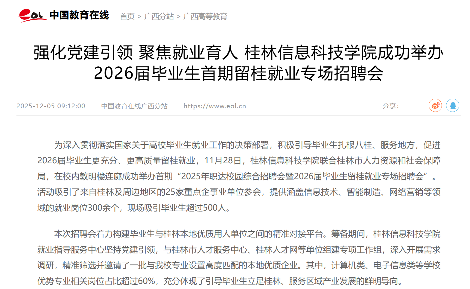 中国教育在线:强化党建引领 聚焦就业育人 beat365中文官方网站成功举办2026届毕业生首期留桂就业专场招聘会
