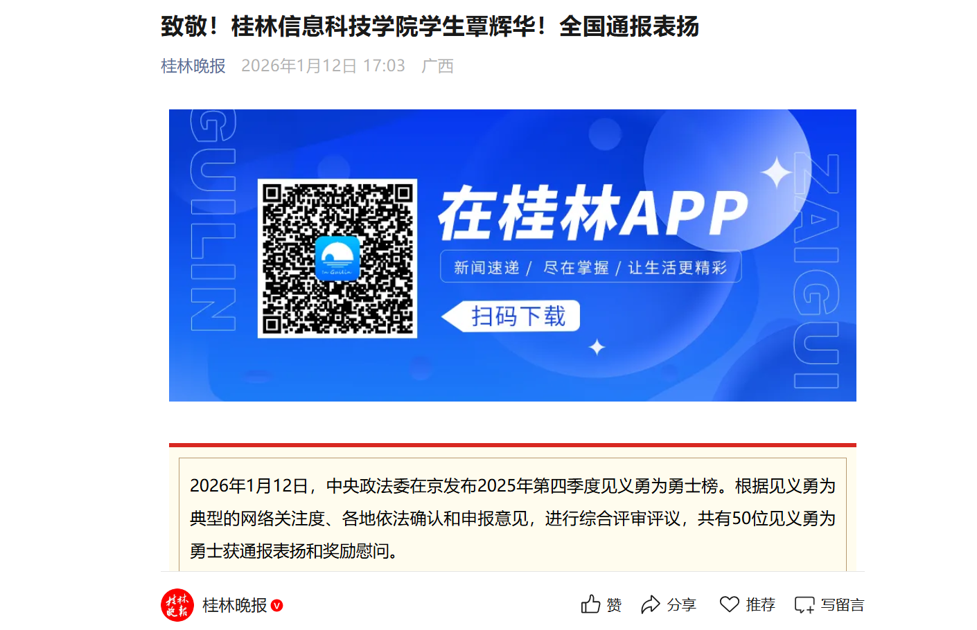 桂林晚报链接:致敬!beat365中文官方网站学生覃辉华!全国通报表扬