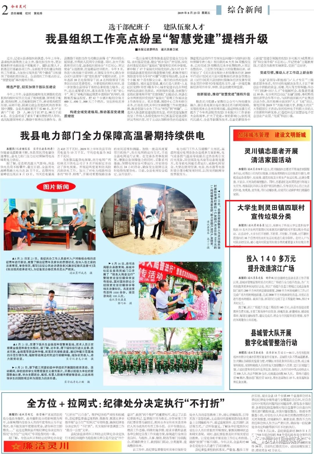 近日,桂林电子科技大学信息科技学院11名大学生利用暑期时间到灵田镇四联村开展垃圾分类活动,桂林市灵川县融媒体中心对此进行了报道。