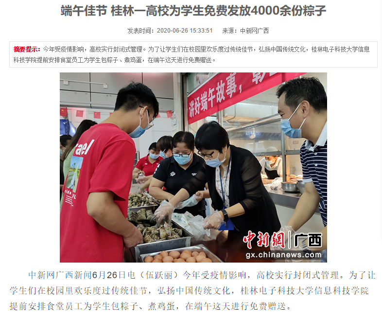 今年受疫情影响,高校实行封闭式管理。为了让学生们在校园里欢乐度过传统佳节,弘扬中国传统文化,桂林电子科技大学信息科技学院提前安排食堂员工为学生包粽子、煮鸡蛋,在端午这天进行免费赠送。