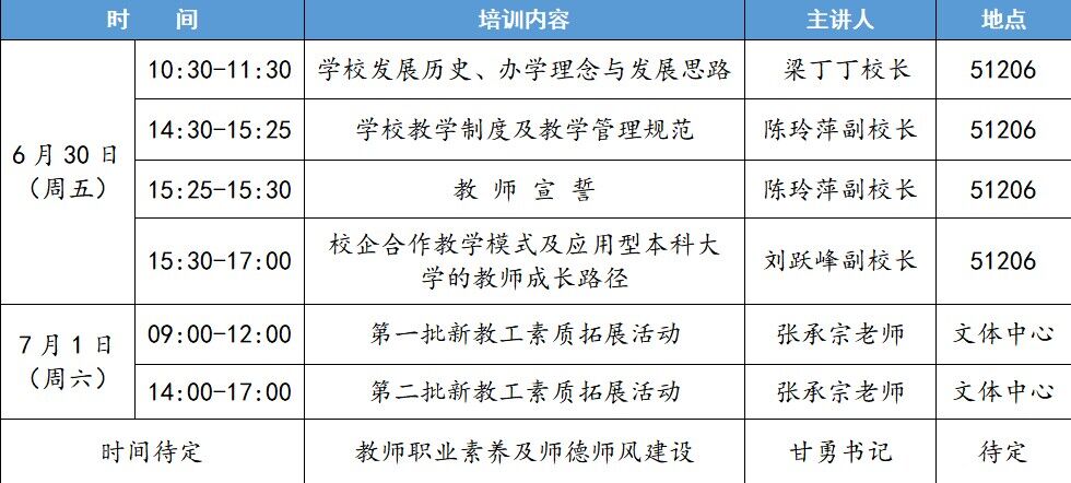 为全面贯彻新时代党的教育方针,落实董事会对加强学校教职工队伍建设的要求,提升专业知识、专业技能及综合素养,增强新教工的责任感、使命感,学校决定开展新教工培训工作,现将有关事项通知如下: