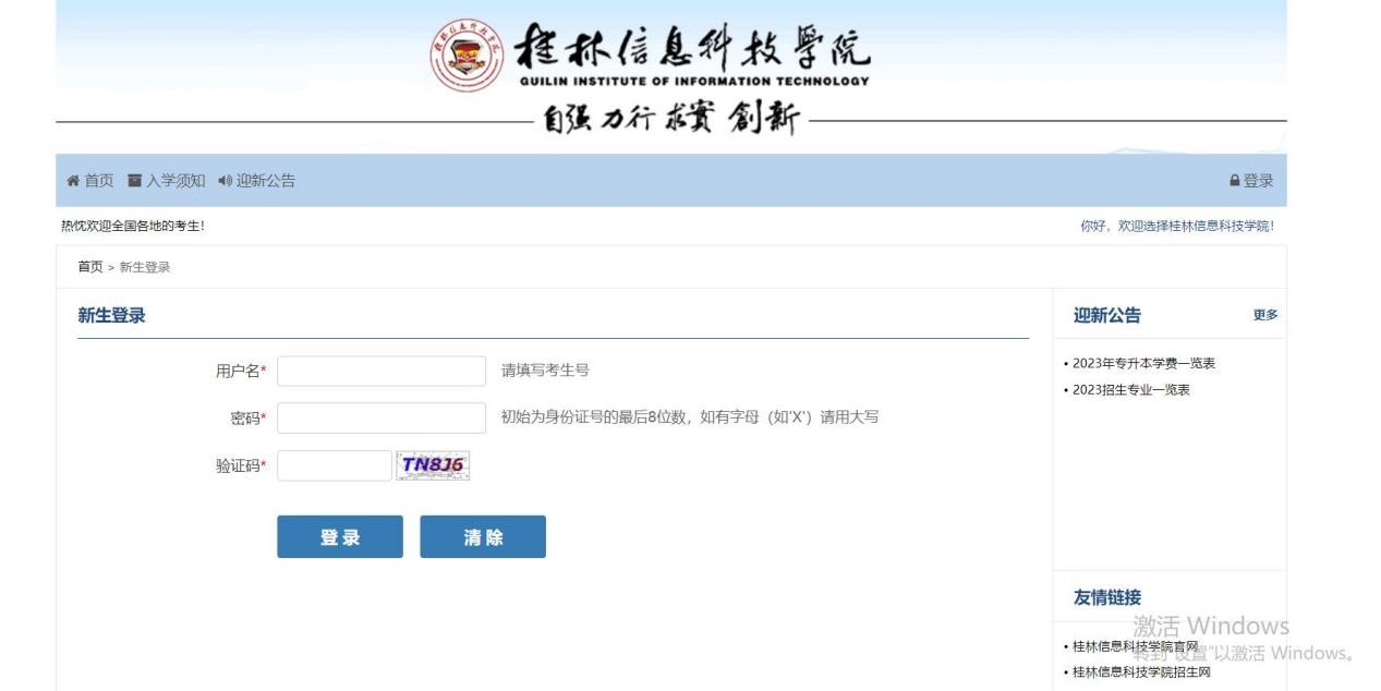 2、用户输入账号、密码及验证码,点击【点击登录系统】按钮,即可登录迎新系统首页。账号为用户高考时的考生号,初始密码为该考生的身份证后8位(如有字母“如X”,请用大写)。迎新系统上方有各模块链接,可点击修改或直接跳转到相应界面。