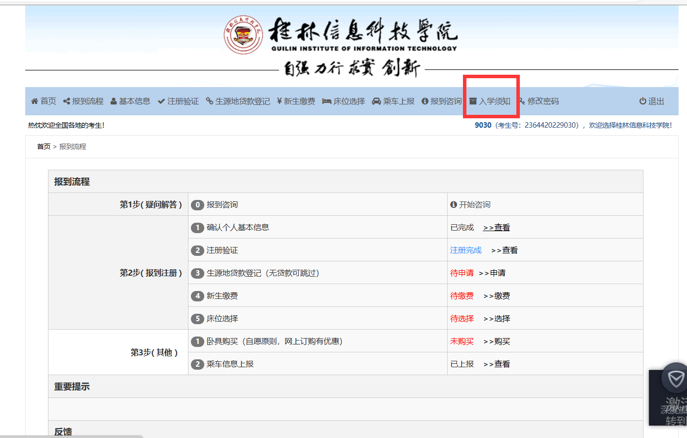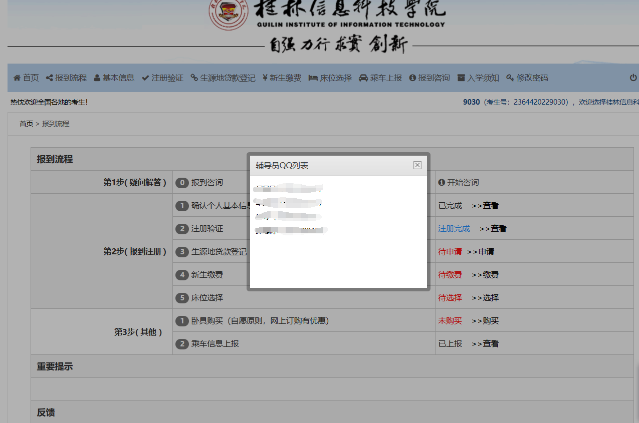 1、在系统首页,点击【报到流程】按钮,即可进入到报到页面。