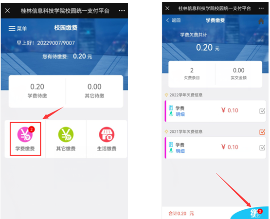 6、新生缴费(缴费项目与金额此处仅为演示操作,学生缴费时以实际项目与金额为准)。用户可查看费用明细。
