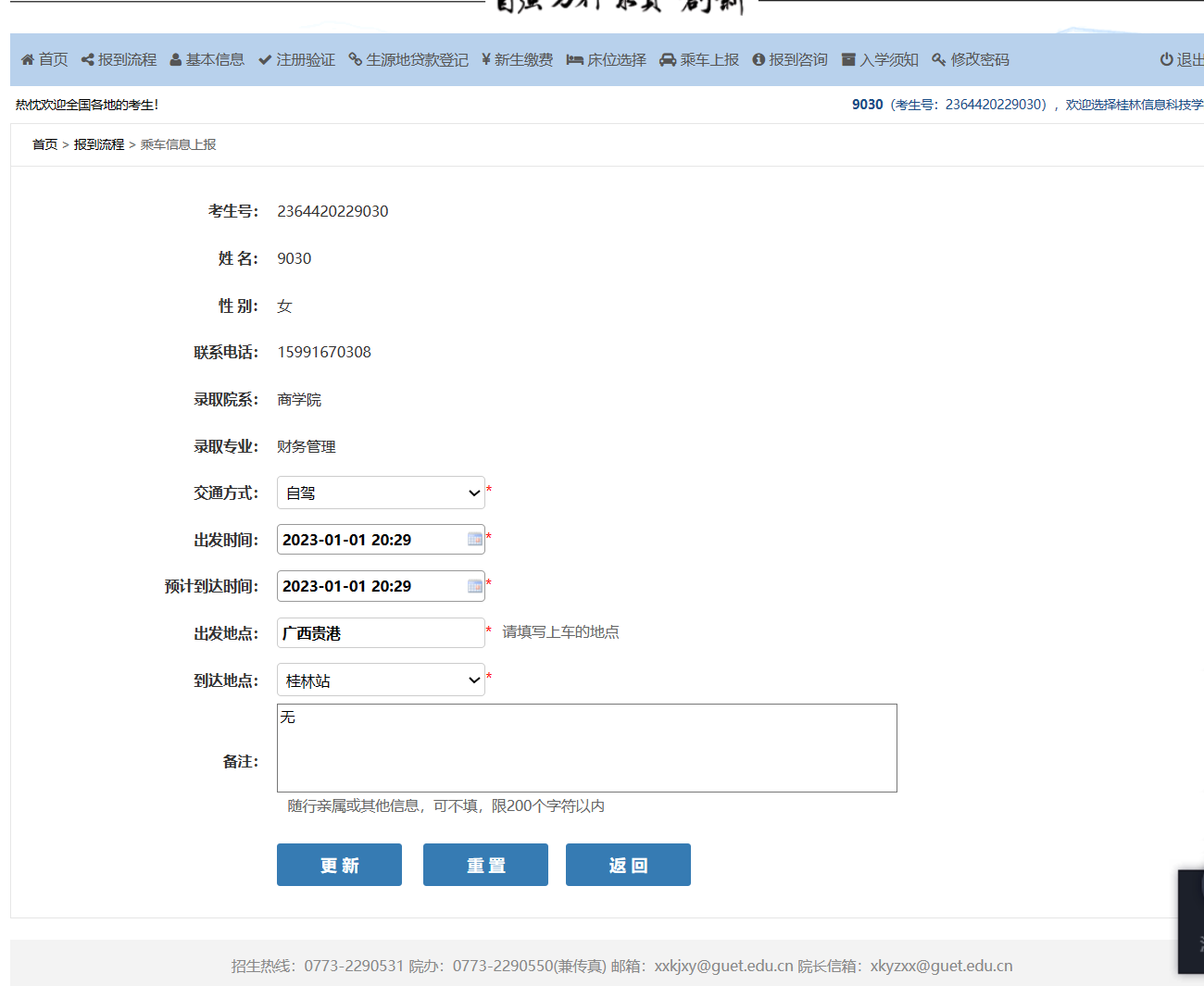 9、乘车信息上报。该功能主要方便学校掌握新生到校报到的时间、乘车方式和抵达地点,便于学校安排专车接站。按照页面提示填写相关信息,其中带“*”的类目为必填项。填写完之后点击【提交】按钮。