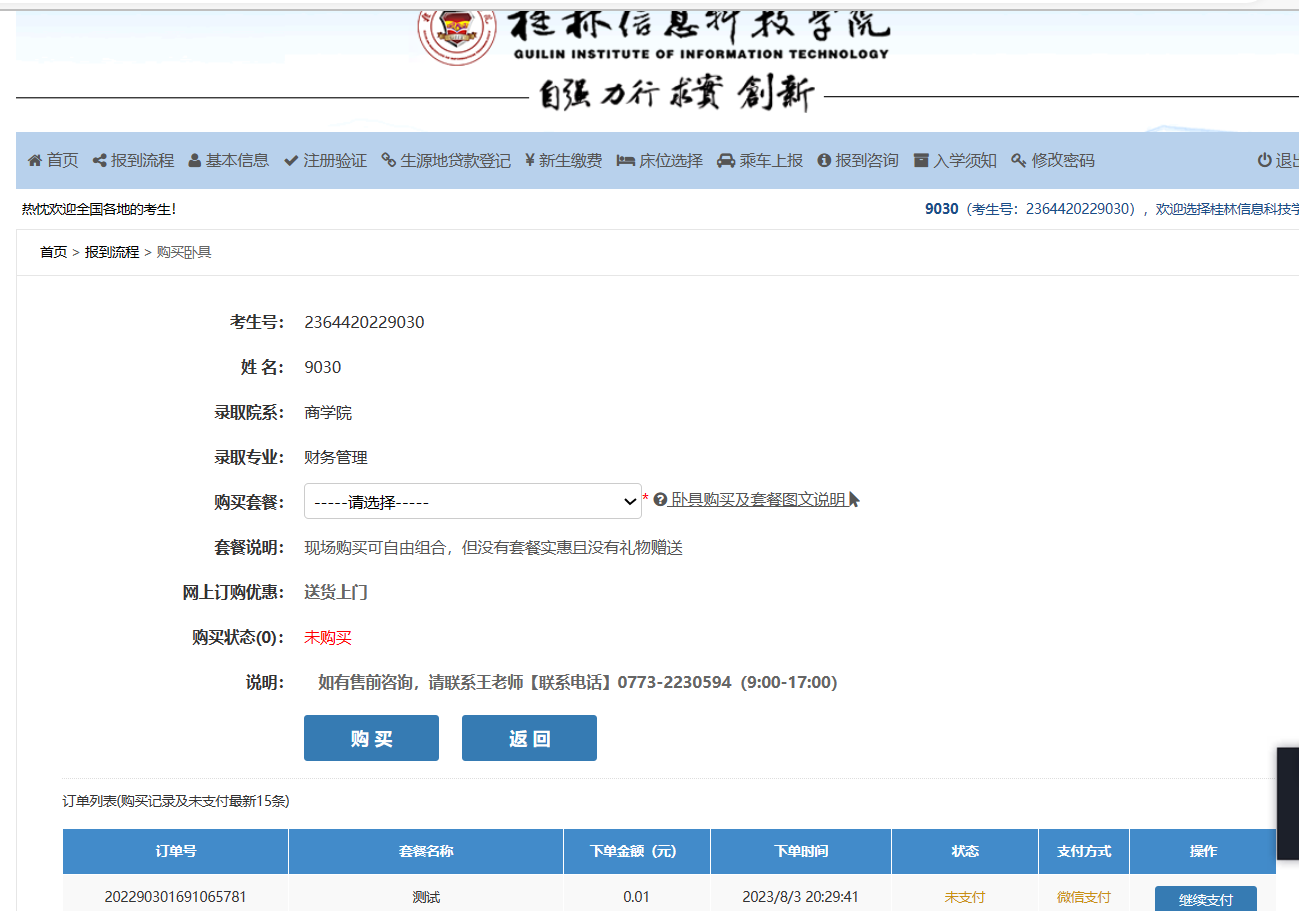 8、卧具购买。(请各位新同学结合自身情况自愿购买)该功能主要方便学生可以选购有质量保证的床上及生活用具。点击报到流程中的【卧具购买(自愿原则)】中的“购买”链接,跳转至【卧具购买】页面。点击【购买套餐】后面的“?”可以查看套餐的具体信息。