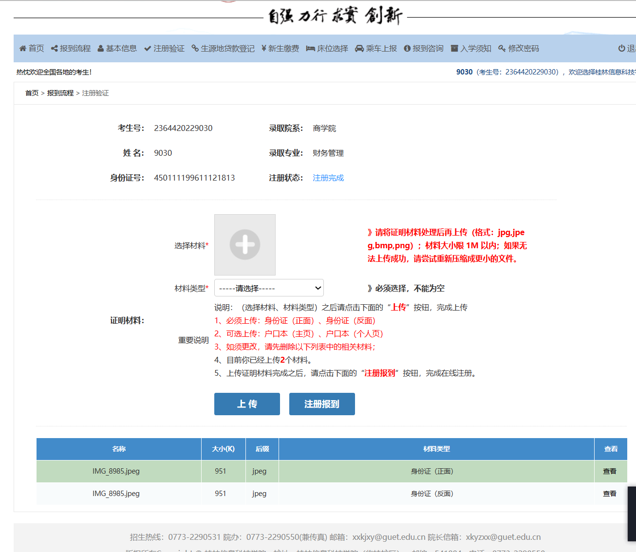 4、注册认证。上传材料进行认证,其中身份证正反面必须上传,户口本等资料可选择上传。点击“+”上传照片,然后点击【上传】按钮,上传后,在页面底部的列表选择要查看的已上传材料。上传资料完毕点击【注册报到】即可。
