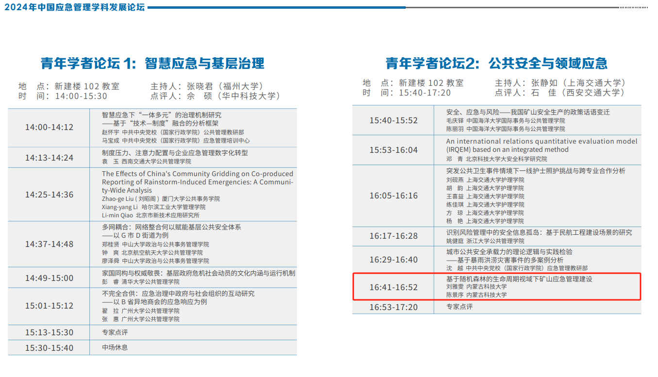 本次会议设立“青年学者论坛”。金年会硕士研究生提交了论文《基于随机森林的生命周期视域下矿山应急管理建设》,并在青年学者论坛中以口头报告形式进行了分享与交流。研究立足于矿山应急文化建设,运用随机森林算法技术探究在矿山应急管理建设不同生命周期下应急文化因素所呈现的影响性。