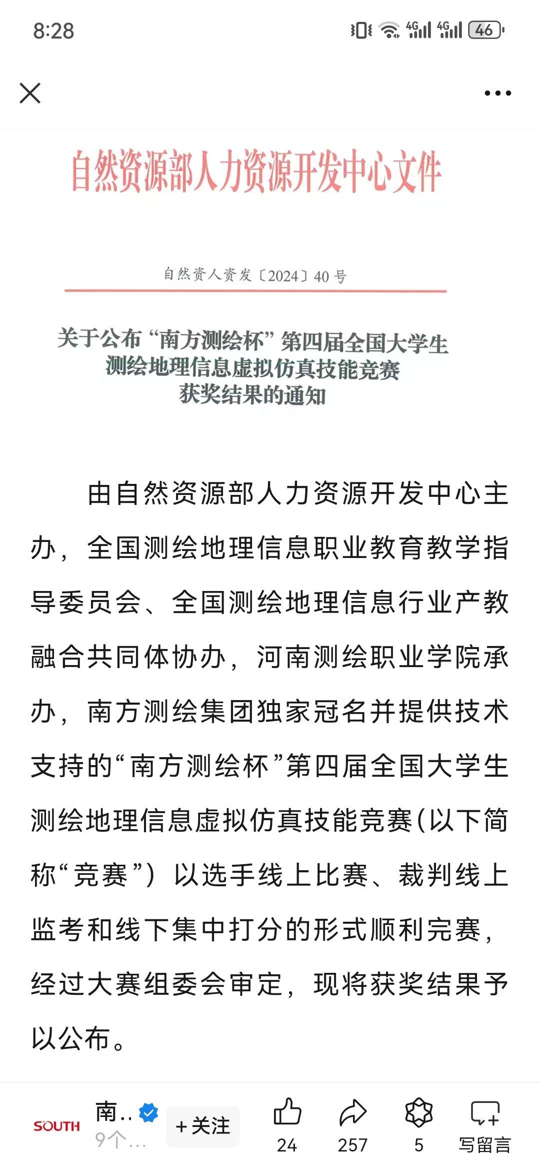 2024年11月9日,由自然资源部人力资源开发中心主办,全国测绘地理信息职业教育教学指导委员会协办的第四届全国大学生测绘地理信息虚拟仿真技能竞赛隆重开幕。本次竞赛设本科、高职专科、中职3个类别,每个类别设虚拟仿真数字测图、无人机航测虚拟仿真、机载激光雷达虚拟仿真3个赛项。