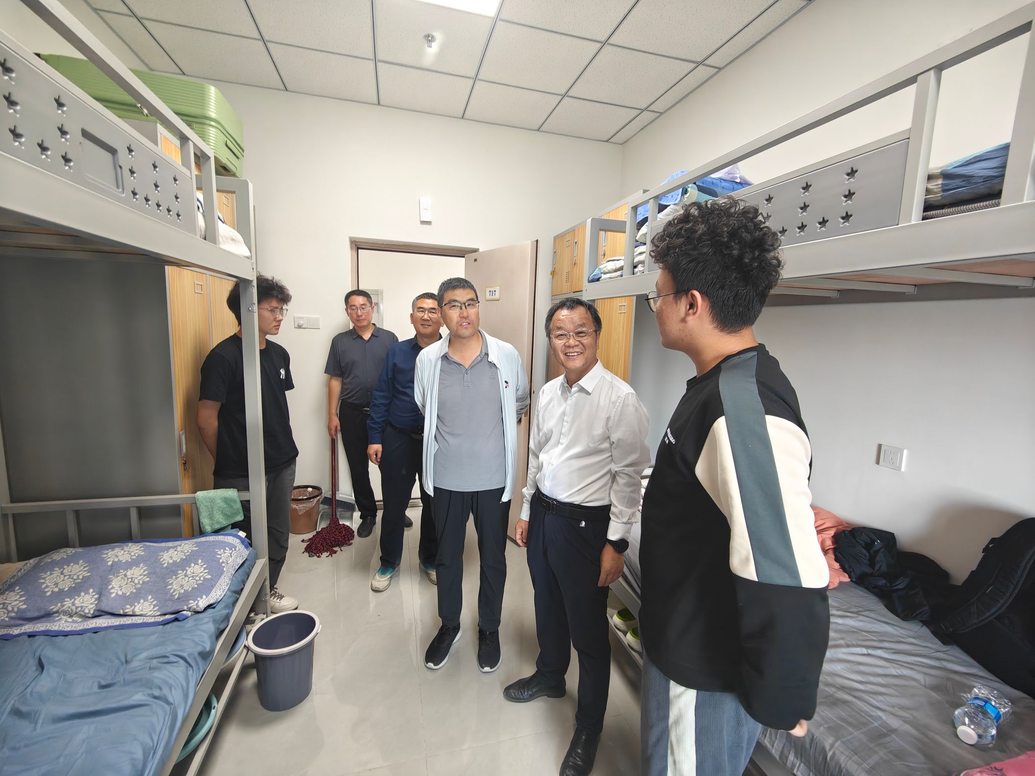 9 月 9 日下午,由校党委常委、副校长李卫平与学院党委领导班子、驻楼辅导员共同组成的慰问小组,深入学院学生集中的科苑东区8号楼、28号楼男生宿舍,开展学生情况调研与新生关怀慰问工作。本次走访聚焦学生在校学习生活实际需求,旨在通过 “零距离” 沟通,全面掌握学子思想动态、学业进展及宿舍居住状况,切实将学校的关怀与指导传递至每一位学生。