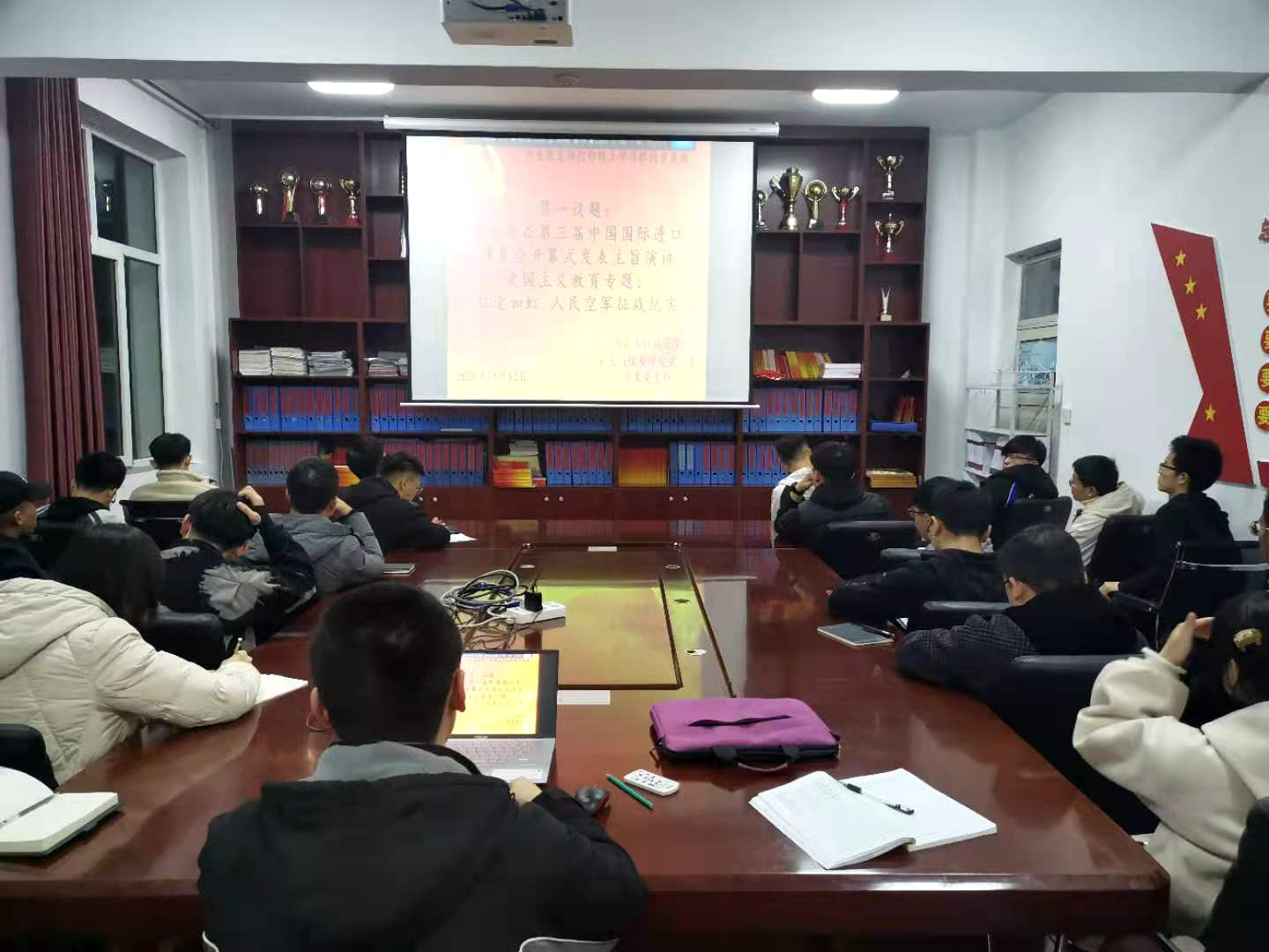 回首人民空军那些刻骨铭心的故事,抒发对人民空军的深厚情义,jinnianhui金年会诚信至上党总支于2020年11月12日晚上19:30,在临曦楼二楼党员之家线上线下同步开展专题理论学习活动。本次学习内容是:第一议题:学习习近平在第三届中国国际进口博览会开幕式上发表主旨演讲讲话精神;爱国主义教育专题:观看《征途如虹,人民空军征战纪实》视频。