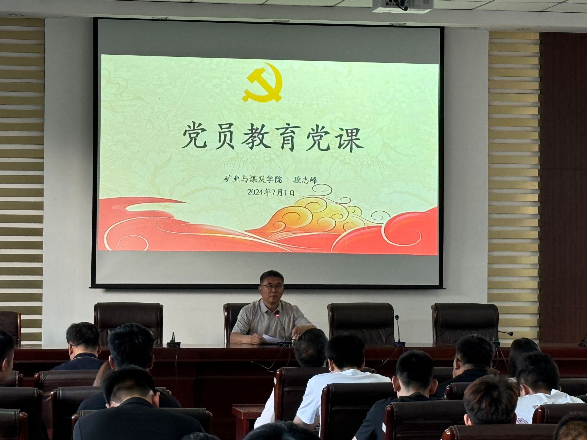 最后学院党委书记段志峰代表学院党委向新加入党组织的32名新党员表示祝贺和欢迎,并以“坚定理想信念,守住纪律底线,做好带头榜样”题为所有党员讲述了一趟生动的七一党课,要求大家牢记共产党员身份,践行入党誓词,坚定理想信念,知敬畏,存戒惧,守底线,发挥模范带头作用,做领头雁,为学校优良考风学风校风做贡献。
