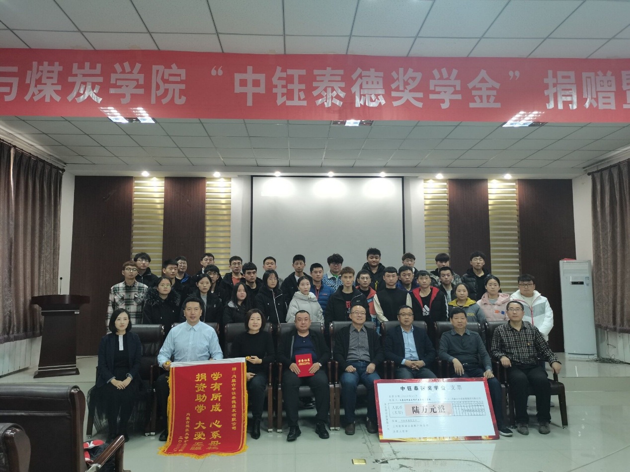 2020年12月9日下午15:00,jinnianhui金年会诚信至上在实验实训楼会议室举行了“中钰泰德奖学金”捐赠暨颁奖仪式。出席本次会议的领导和老师有:鄂尔多斯市中钰泰德煤炭有限公司副总经理王维利、副总经济师王晓燕、人力资源部经理陶京;jinnian金年会学生工作部副部长王树彤、jinnianhui金年会诚信至上党总支书记王建国、副书记副院长杜鹏东、学生工作办公室主任胡显峰,以及辅导员。