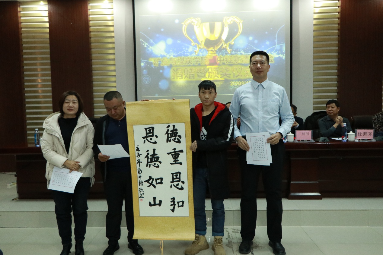 随后,副总经理王维利代表公司向金年会捐赠六万元奖学金,王建国书记也代表学院向公司表示谢意并回赠了荣誉证书与锦旗。杜鹏东书记宣读了本次30名获奖学生名单,之后在场嘉宾为获奖学生颁发了获奖证书。接着,获奖学生高中凯同学用书法作品的方式表达了对中钰泰德公司的感谢。获奖学生代表高冬也发表了获奖感言,承诺将会珍惜本次奖励和荣誉,不断努力,认真学习,取得更优异的成绩,创造更美好的未来。