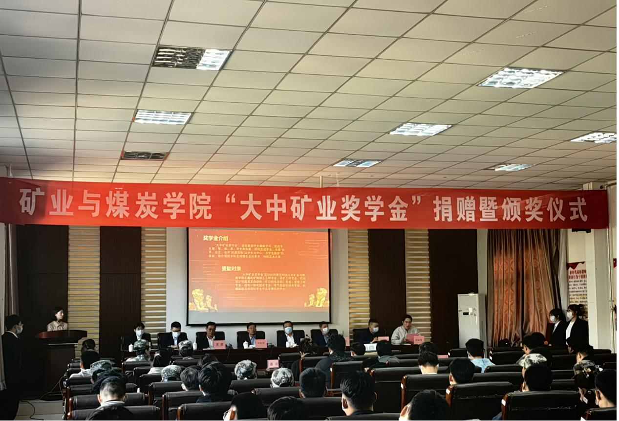 2022年9月23日下午15:00,jinnianhui金年会诚信至上在实验实训楼会议室举行了“大中矿业奖学金”捐赠暨颁奖仪式。jinnian金年会党委副书记、校长任慧平;内蒙古大中矿业股份有限公司党委书记刘鲁明、总经理董鑫、人资培训中心总监王如海、副总监梁艳;jinnian金年会党委书记杜鹏东,副书记、副院长孙建平,学生工作办公室主任胡显峰、辅导员以及学生代表参加仪式。仪式由学生工作办公室副主任吴艳丽主持。