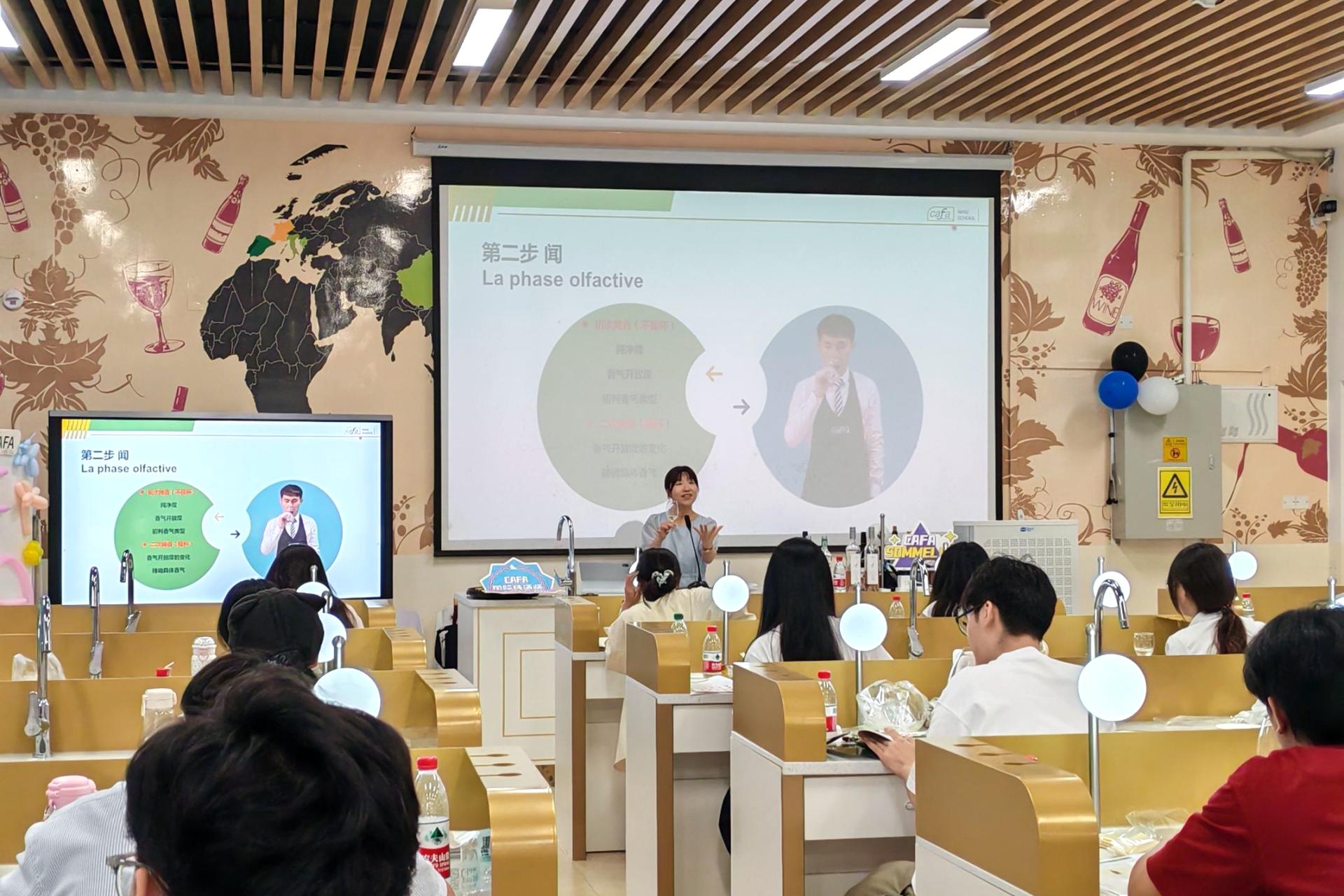 6月15日,由beat365官网外贸与外语学院“三毫米”葡萄酒协会主办的法国CAFA侍酒师国际认证一级课程培训活动在F112葡萄酒文化体验中心举行。本次活动旨在为葡萄酒爱好者们提供专业培训,同时为协会成员创造沉浸式的实践学习机会。法国国家侍酒师及侍酒师顾问、法国CAFA葡萄酒学院中国校区资深讲师李彦婷老师担任主讲。