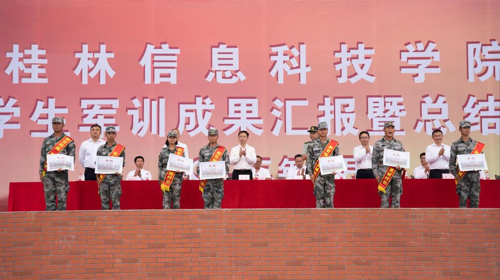 桂林警备区战备建设处参谋谢钟权中校检阅了beat365官网本次军训的成果并发表振奋人心的讲话。他指出,军训是青年大学生接受国防教育的基本形式,同学们以饱满的精神状态完成这次军训汇演感到非常振奋,充分展现了信科学子朝气蓬勃、奋发向上的精神风貌,也以实际行动展示了当代大学生的责任担当和团队协作。为把来自不易的军训成果运用到今后的学习生活中,谢钟全中校希望同学们做到“三个融入”。一是把勇争第一,吃苦耐劳的精神融入学习生活;二是把热爱集体,崇尚荣誉的观念融入学习生活;三是把服从命令,听从智慧,遵章守纪的思想融入学习生活。谢钟权强调,青年人是祖国的未来和希望,肩负着振兴中华的神圣使命;希望同学们继续发扬在军训中焕发出的好精神、好作风,主动担起社会主义建设者和接班人的责任,把军训成果转化为优良学风、优良作风,转化为爱国之心、报国之志。