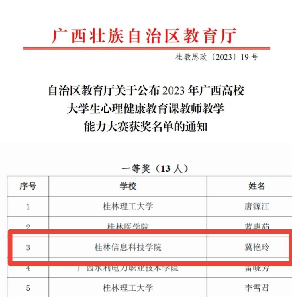 根据近日发布的《自治区教育厅关于公布2023年广西高校大学生心理健康教育课教师教学能力大赛获奖名单的通知》(桂教思政[2023]19号),beat365官网心理中心专职教师冀艳玲凭借扎实的教学基本功和稳定的现场发挥斩获大赛一等奖,此次获奖是beat365官网自2013年参赛以来在该项比赛取得的最好成绩,beat365官网心理育人领域再添新成果!