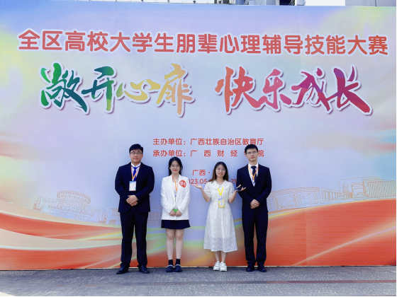 近日,由广西壮族自治区教育厅主办、广西财经学院承办的全区高校大学生朋辈心理辅导技能大赛圆满结束。经过激烈角逐,由学校老师王利南、冀艳玲和罗慧芳指导,学生刘冲、周海婷和王永杰组成的队伍荣获本次大赛的二等奖。