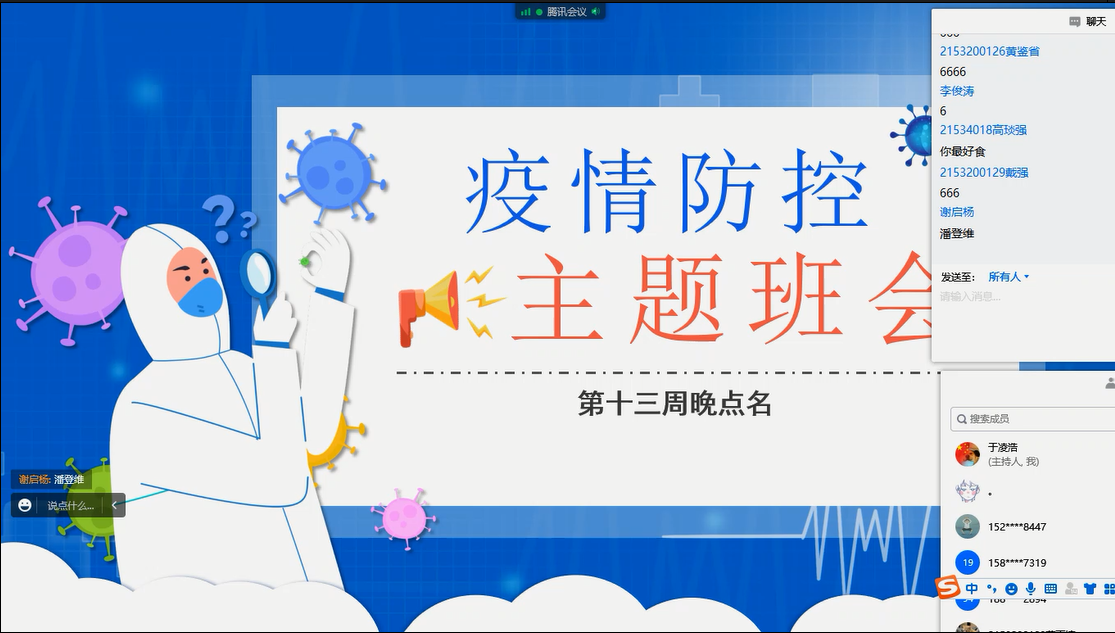会议上,辅导员首先与学生强调在疫情期间尽量做到非必要不外出,如因特殊情况外出,需严格按照疫情防控属地要求和校园规定执行;其次,辅导员向大家讲述根据桂林疫情防控全域网格管理要求,为消除疫情通过与校外人员接触输入校园的风险隐患,暂停快递和外卖进校,请广大同学理解、支持和配合。最后,因目前严峻的疫情防控形势,根据桂林市疫情防控指挥部工作安排及疫情防控需要,学校于11月25日—29日继续开展全员核酸检测,辅导员与各位同学讲述近期学校的核酸安排并希望全体学生能理解并积极配合疫情防控工作。