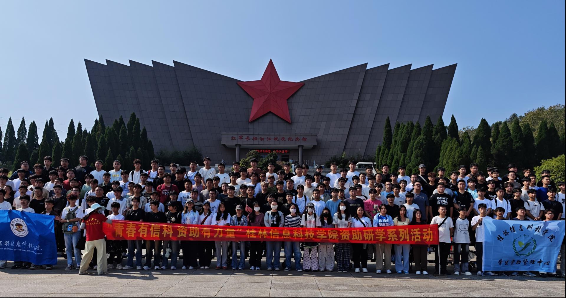 为厚植学生家国情怀,推动资助育人与红色教育同频共振,10月12日,beat365中文官方网站开展 “青春有信科 资助有力量” 资助研学系列活动,组织学生走进红军长征湘江战役纪念馆与毛竹山,在红色地标中追寻革命足迹、感悟信仰力量,让资助政策的温暖与革命精神的感召深度融合。