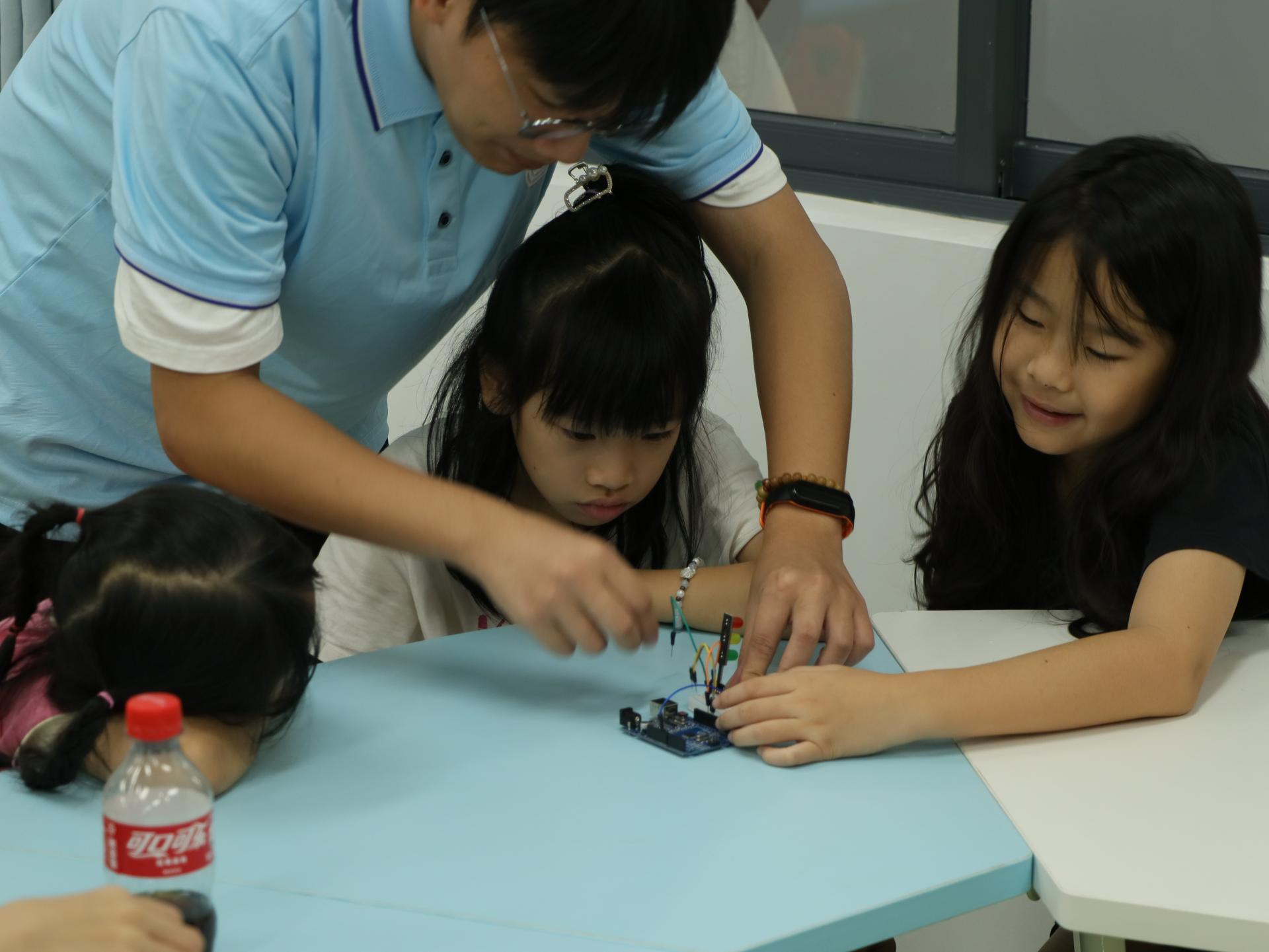 在电子编程课上,孩子们从认识Arduino Uno开发板起步,先以无代码方式点亮LED灯,逐步掌握编程逻辑,最终实现流水灯、模拟交通红绿灯及超声波测距等功能,建立起电子编程与硬件控制的系统认知。Scratch课程围绕“小猫上学记”“太空战机闯关”等主题,通过图形化指令模块,让孩子们在趣味互动中掌握编程技能,培养逻辑思维与创意表达能力。3D打印课深受喜爱,孩子们发挥空间想象力设计卡通钥匙扣、迷你机器人等作品,课程通过“双人协作检查制”强调安全规范,帮助他们在掌握技术的同时养成严谨态度。科普实验课则将科学融入生活,“泡泡龙”“一封密信”等实验通过生活化类比阐释原理,有效激发了学生的探索欲与动手能力。