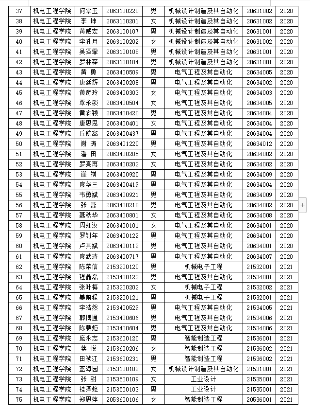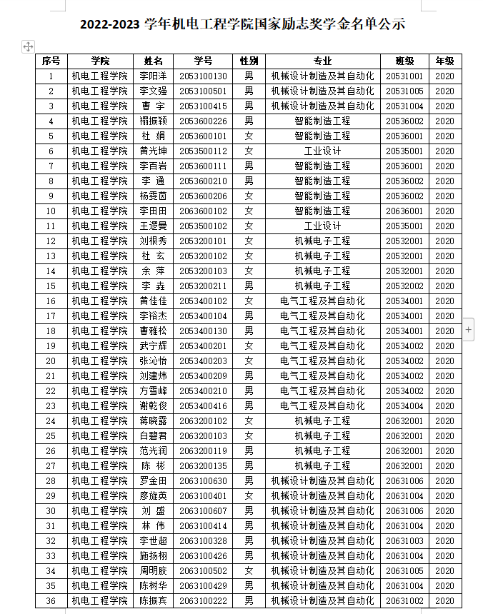 2022-2023学年机电工程学院国家励志奖学金名单公示