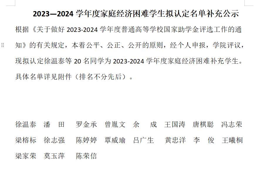 2023—2024学年度家庭经济困难学生拟认定名单补充公示
