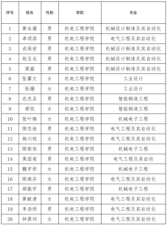 根据桂教学生〔2025〕4号《自治区教育厅关于开展2025届全区普通高等教育优秀毕业生认定工作的通知》文件精神及相关评奖条件,本着公平、公正、公开的原则,经学生个人申请,学院评审,现拟推荐张馨文等20位同学为机电工程学院2025届区优秀毕业生候选人。具体学生名单公示如下: