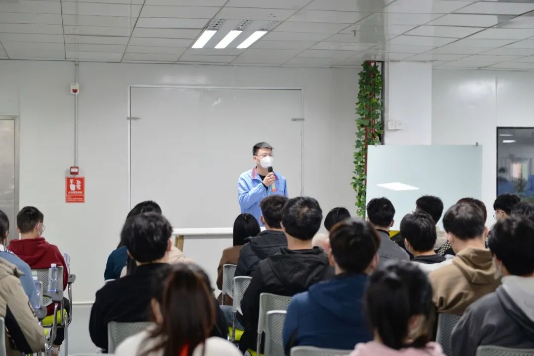 下午,亿纬锂能副总裁黄国民从电池分类与原理、电池性能参数、电池应用场景、公司产品线等多个方面为大家详细介绍了锂电池基础知识,同学们热情高涨,积极提问互动,收获了满满的知识。游学结束后,HR组织了一场篮球友谊赛,让同学们深入体验亿纬人的日常生活,进一步增进亿纬人与桂林信科同学之间的彼此沟通。