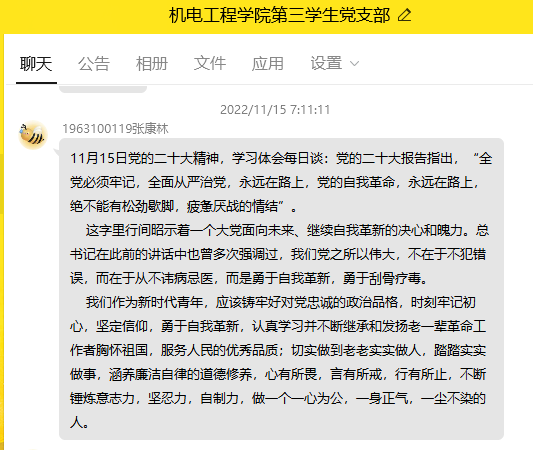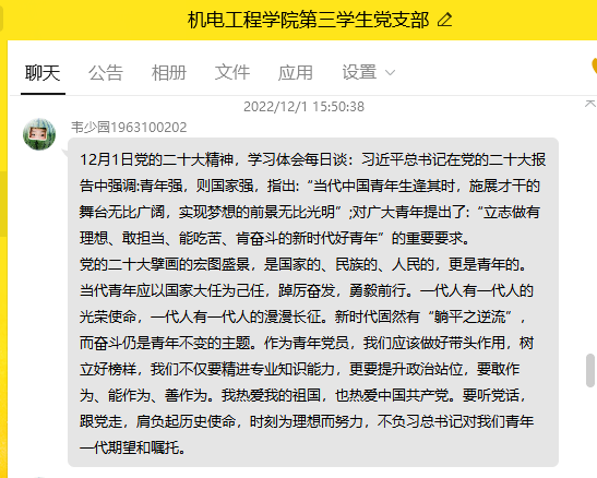 为深入学习宣传贯彻党的二十大精神,机电工程学院学生党支部开展党的二十大精神、学习体会每日谈活动,组织学生党员在QQ群内分享本人学习二十大心得的体会。