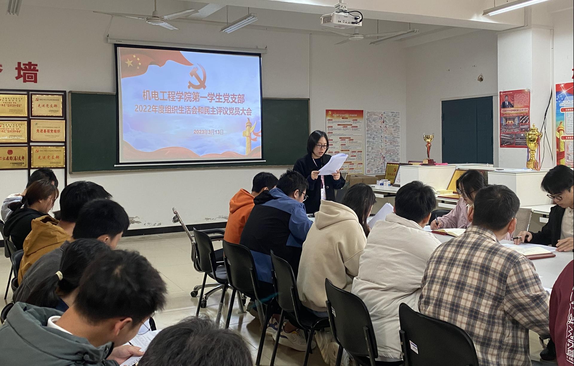 为深入学习贯彻党的二十大精神,严格党内政治生活,提升基层党组织战斗力,3月13日,机电工程学院第一学生党支部在11311会议室召开2022年度组织生活会暨民主评议党员大会。会议以“深入学习贯彻党的二十大精神,强化党性修养,提升支部战斗力”为主题,支部全体党员参加了会议,会议由支部书记严继玲主持。
