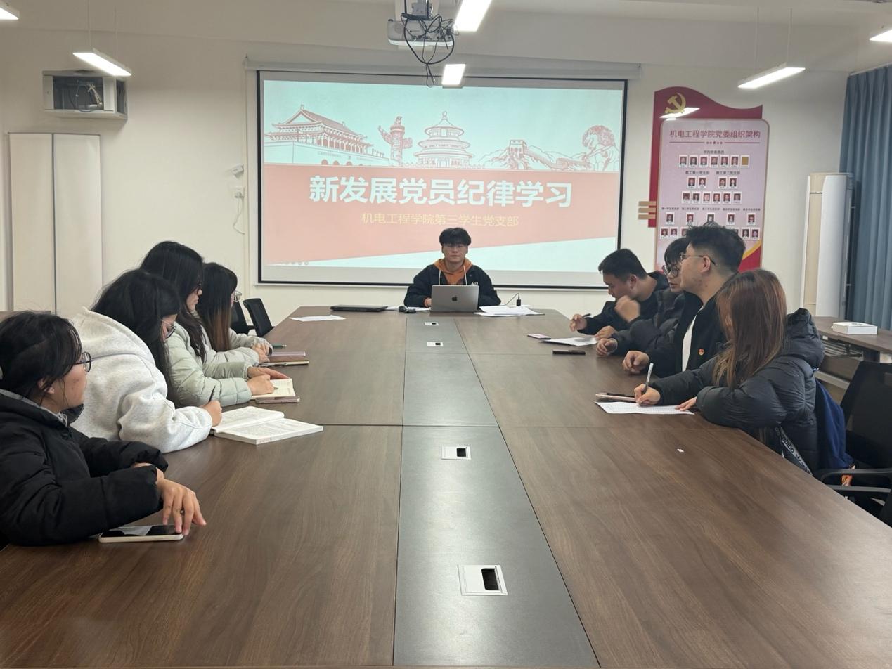 活动中,机电工程学院第三学生党支部书记周天睿围绕“严守党的纪律,争做合格党员”主题,阐述纪律教育重要性,强调新发展党员需从入党之初树立纪律意识。带领大家集中学习《中国共产党章程》等党内法规,解读“六大纪律”核心要义,结合典型案例剖析违纪危害,强化新党员纪律认知。交流研讨中,新发展党员畅谈体会,表态将以党员标准严格要求自己,严守纪律,在学习工作中发挥先锋模范作用。
