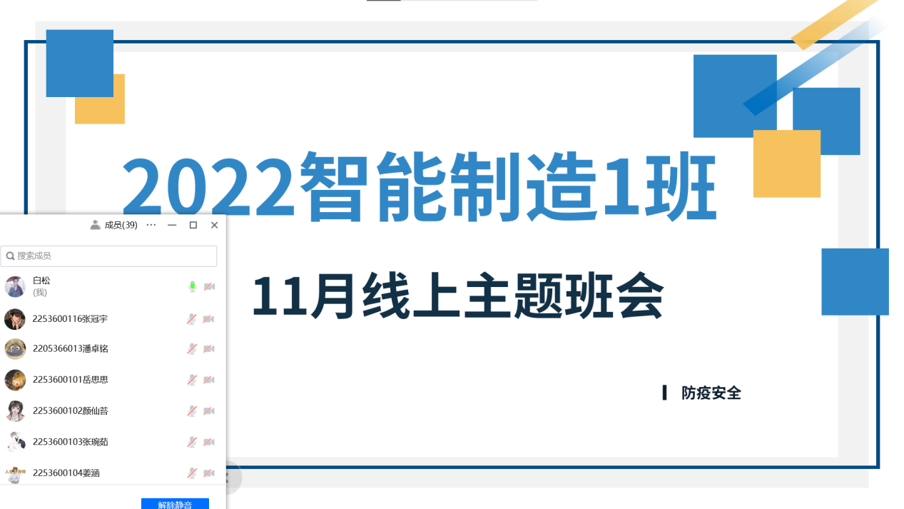 11月29日晚上,2022级智能制造专业一班班主任白松老师与本班同学通过腾讯会议举行了疫情防控与学习规划主题班会。