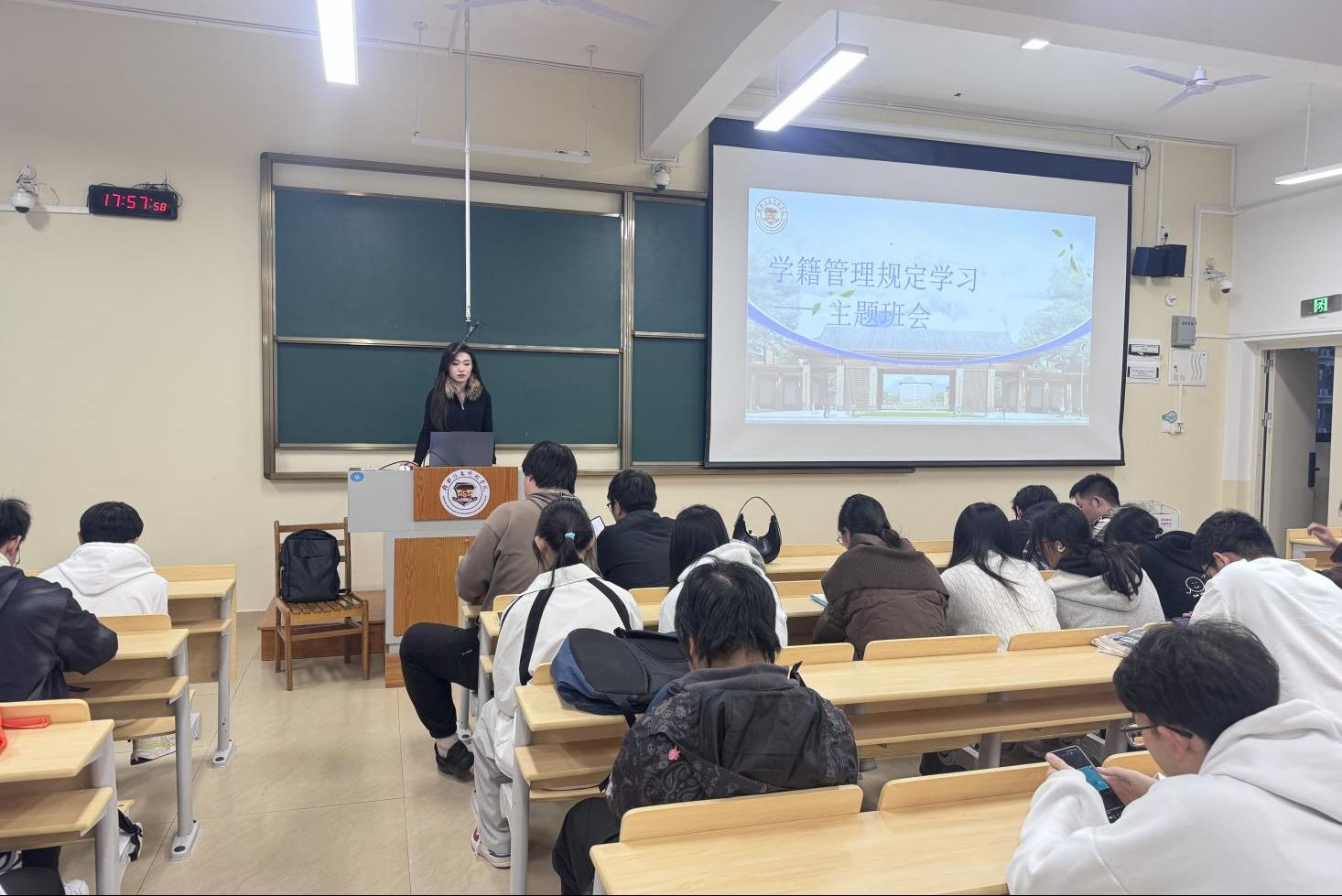 班会伊始,辅导员老师强调了系统学习学校教学管理规章制度的重要性。她指出,学籍管理规定是保障教育教学秩序、维护学生合法权益、促进学生顺利完成学业的根本遵循;学业相关制度则是引导学生科学学习、评价学习成果、实现培养目标的行动指南。清晰掌握这些规定,对于同学们规避学业风险、合理规划进程、激发学习动力具有至关重要的意义。