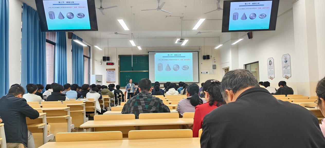 课堂上,唐爱华老师凭借扎实的理论功底与清晰的逻辑脉络展开教学。他以圆柱、圆锥、圆球等生活常见实例切入新课,迅速激发学生学习兴趣;通过多媒体动画演示与板书作图相结合的方式,将抽象的立体空间概念转化为直观平面图形,深入剖析回转体轮廓素线投影规律及可见性判断等重难点。唐老师语言精炼、教态自然,注重互动交流,通过层层设问引导学生主动思考,鼓励学生上台实操绘图并及时纠正错误,有效强化知识点吸收,课堂气氛活跃,教学效果显著。听课过程中,教研室老师们全神贯注、认真记录,既关注教学内容设计与方法运用,也细致观察学生课堂反应与学习状态,一致认可唐老师课堂准备充分、重点突出、讲解透彻,为青年教师提供了优质学习范例。
