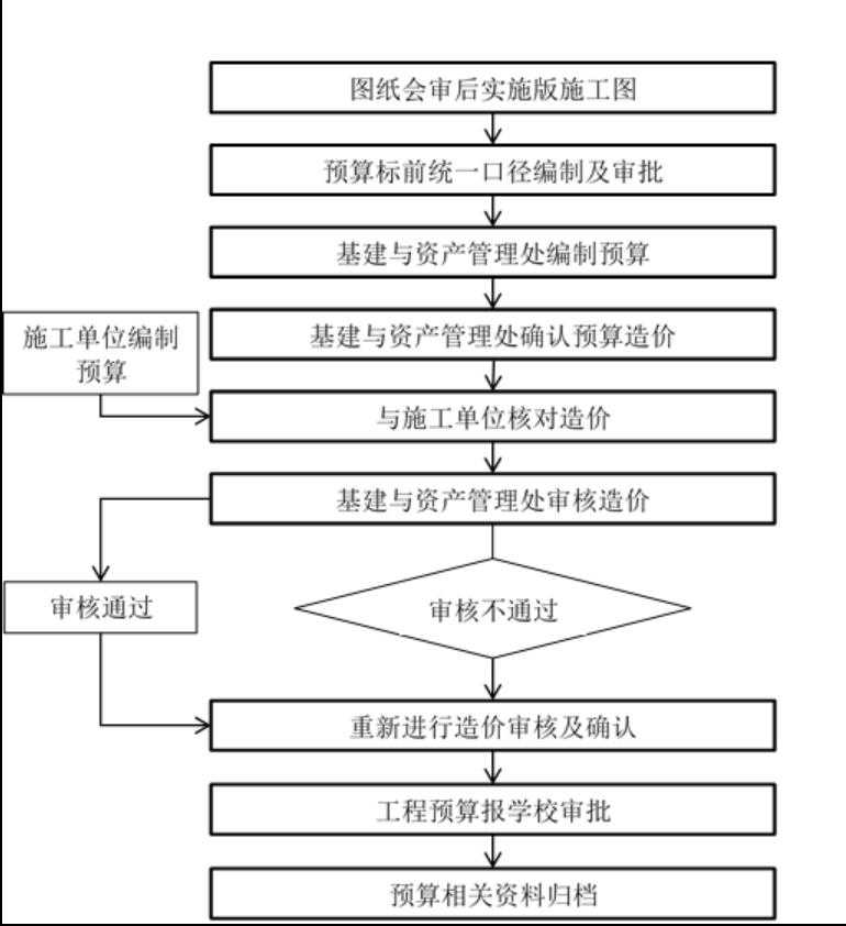 施工单位根据合同、图纸及相关资料在规定时间内完成预算编制,基建与资产管理处与施工单位进行预算核对,核对完成并经其审核确认后,进行审批。