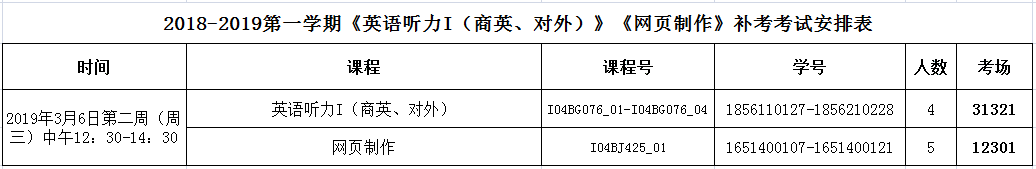 2018-2019第一学期《英语听力I(商英、对外)》、《网页制作》补考考试安排