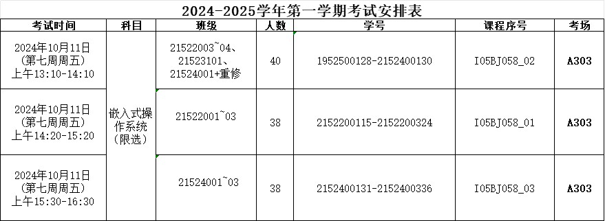 2024-2025学年第一学期《嵌入式操作系统(限选)》考试安排