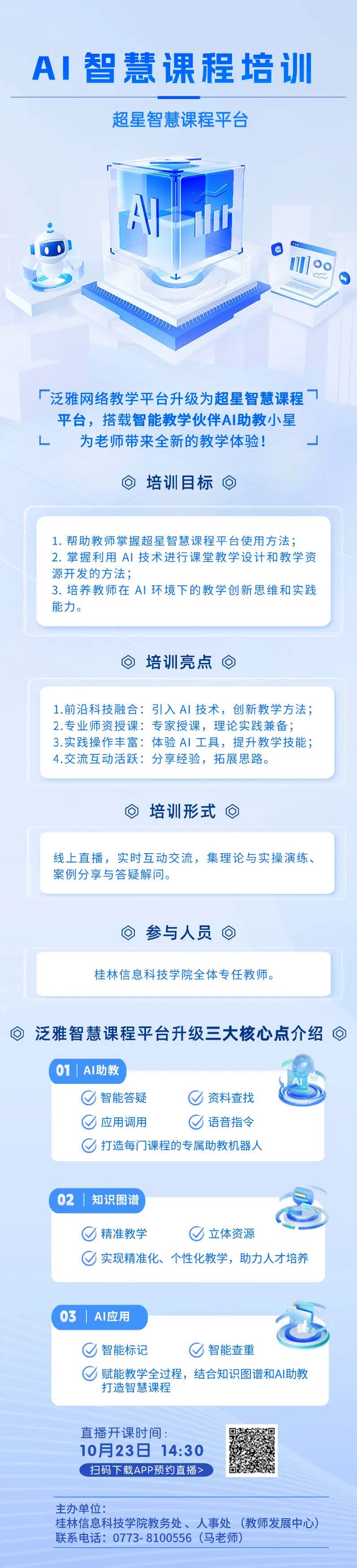 为了探索新时代人才培养的改革新方向和实践新路径,以人工智能赋能教育教学改革创新,全面提升师生数字素养,凝聚新质生产力 ,构建“师/生/机”三元交互的教学新范式,支撑引领产业转型升级,助推beat365官网教育教学高质量发展,学校决定开展基于知识图谱的智慧课程建设培训工作。具体安排通知如下: